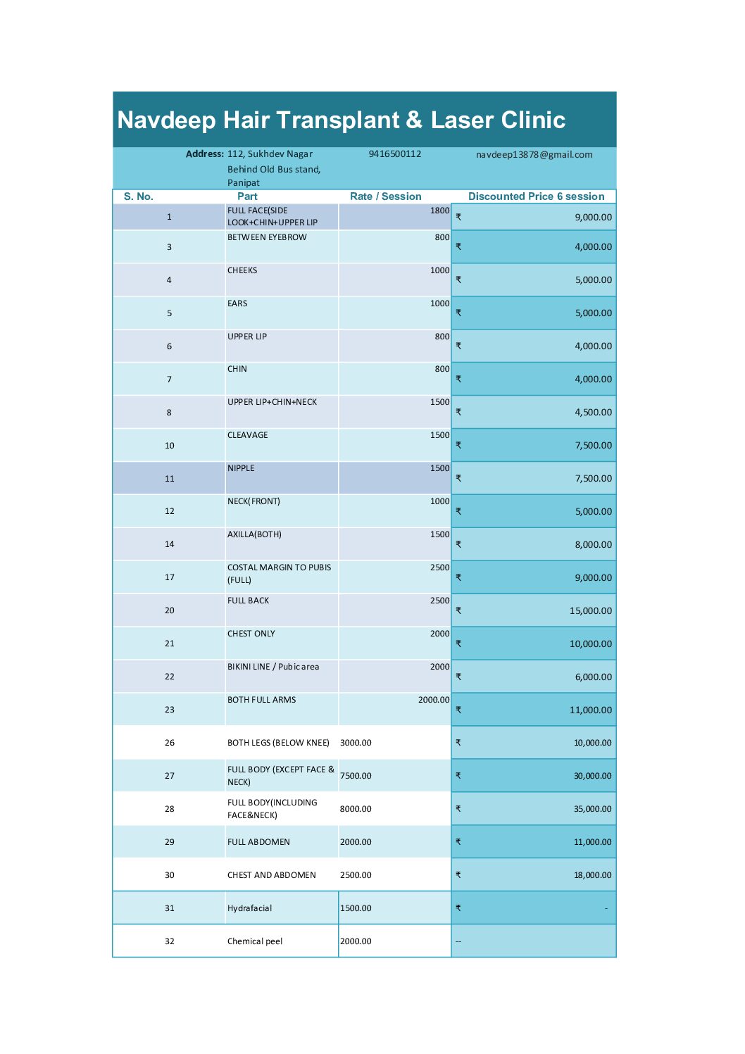 DIODE Laser rate list, Navdeep Hospital, Panipat, Haryana, India: